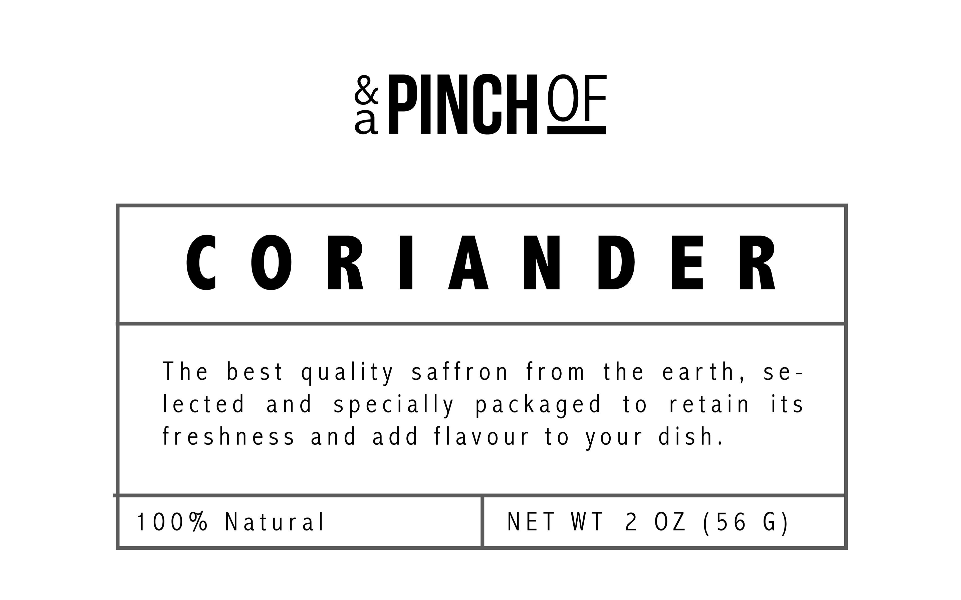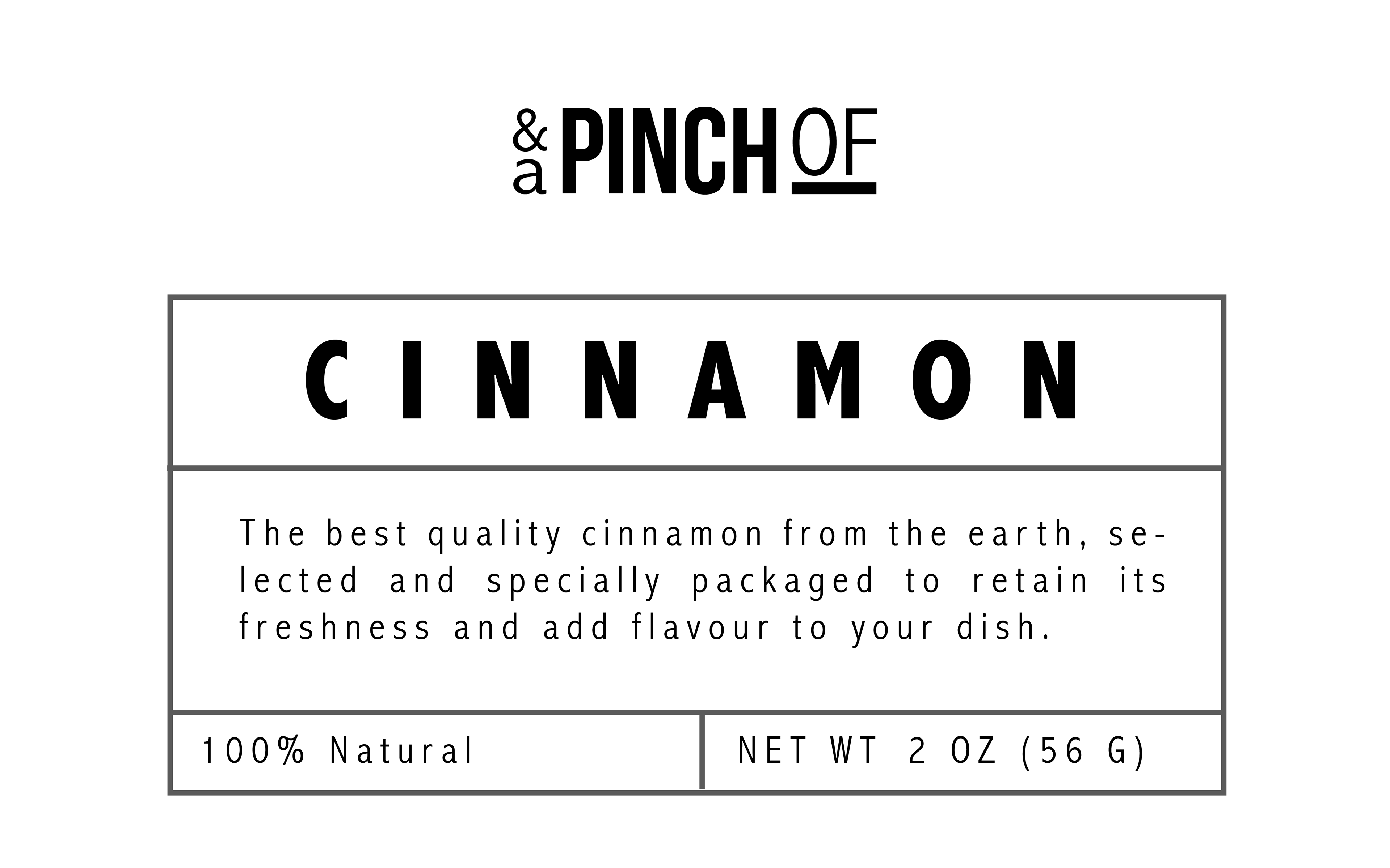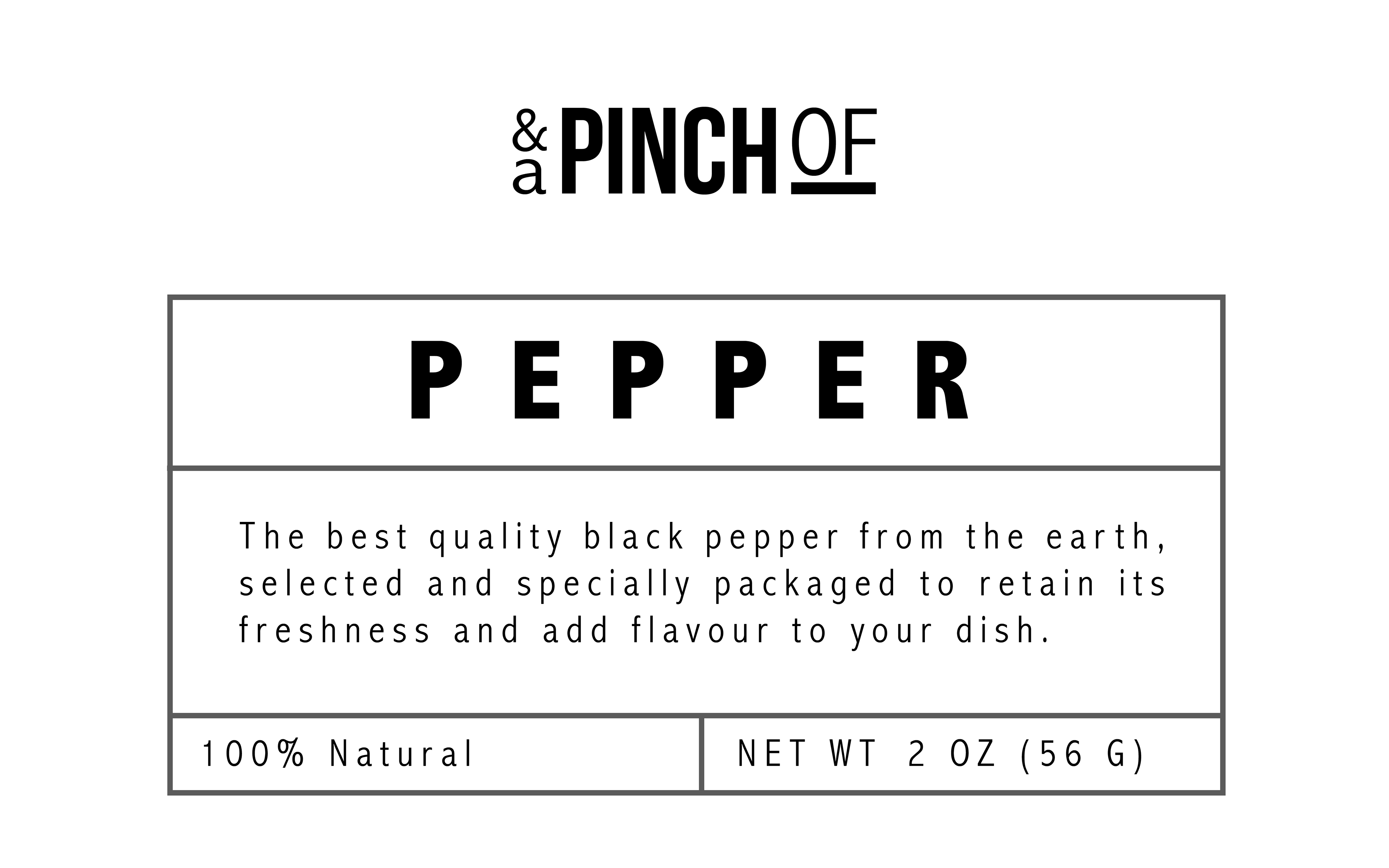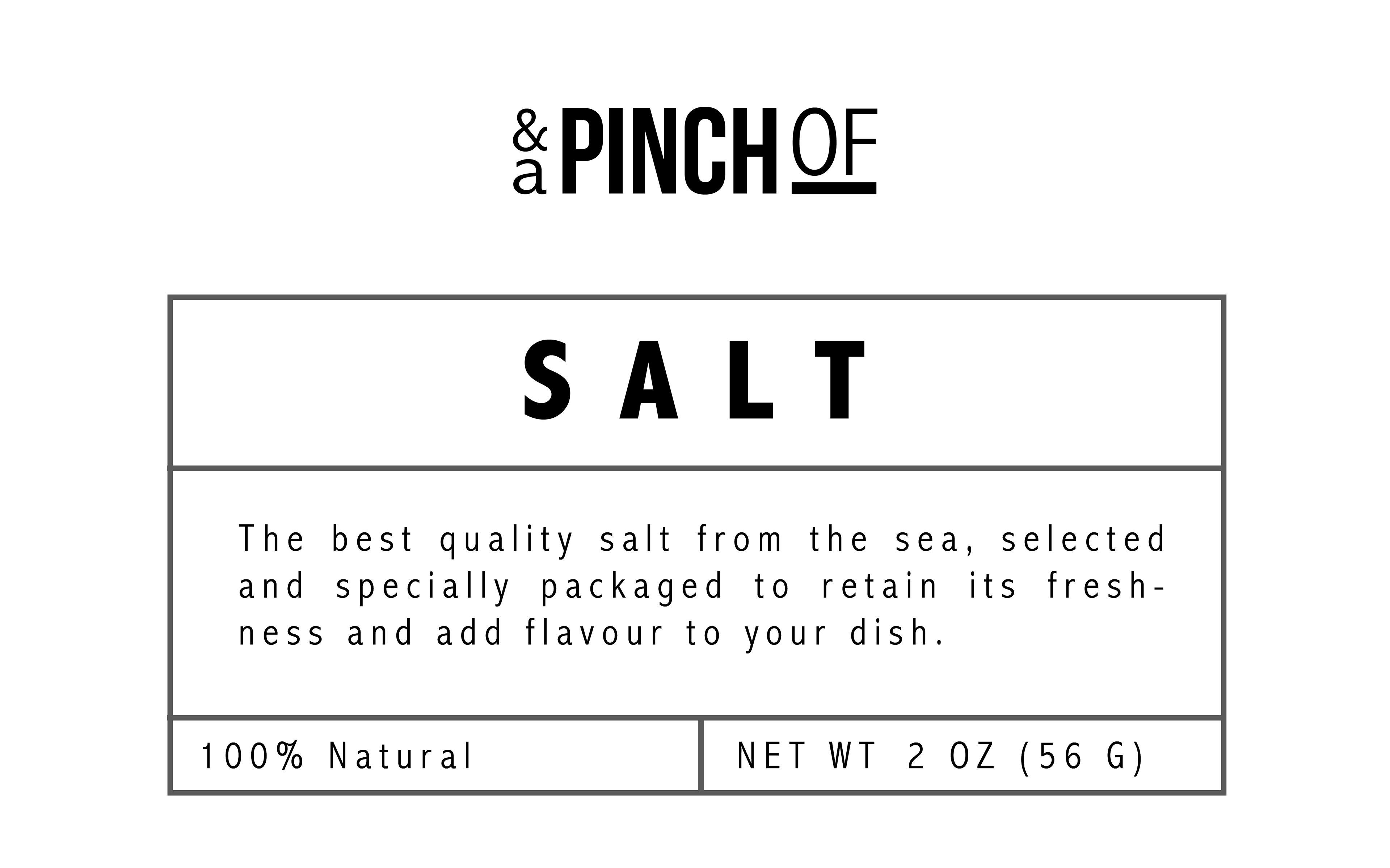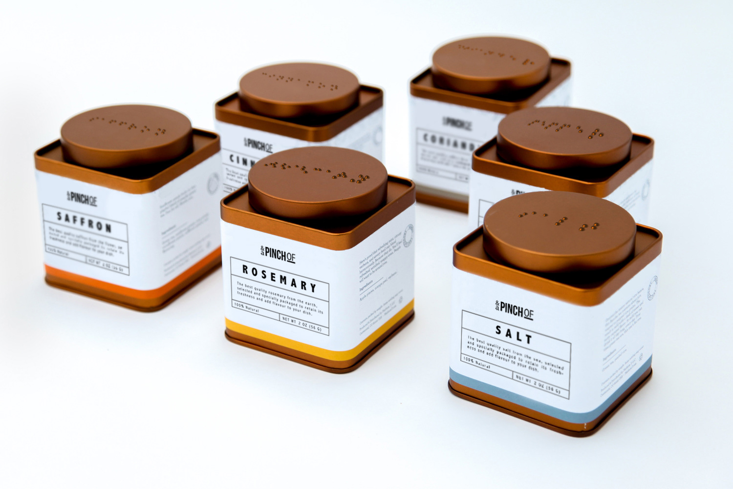 I also wanted to make the containers visually appealing so that the market reach is not only for those who are blind. The logo is "And a Pinch Of." With the spice right under it, I wanted to play off of the phrase "and a pinch of –insert spice here–" in cookbooks. Along with the simple label, each spice has their own color strip at the bottom to add variety to the design.
