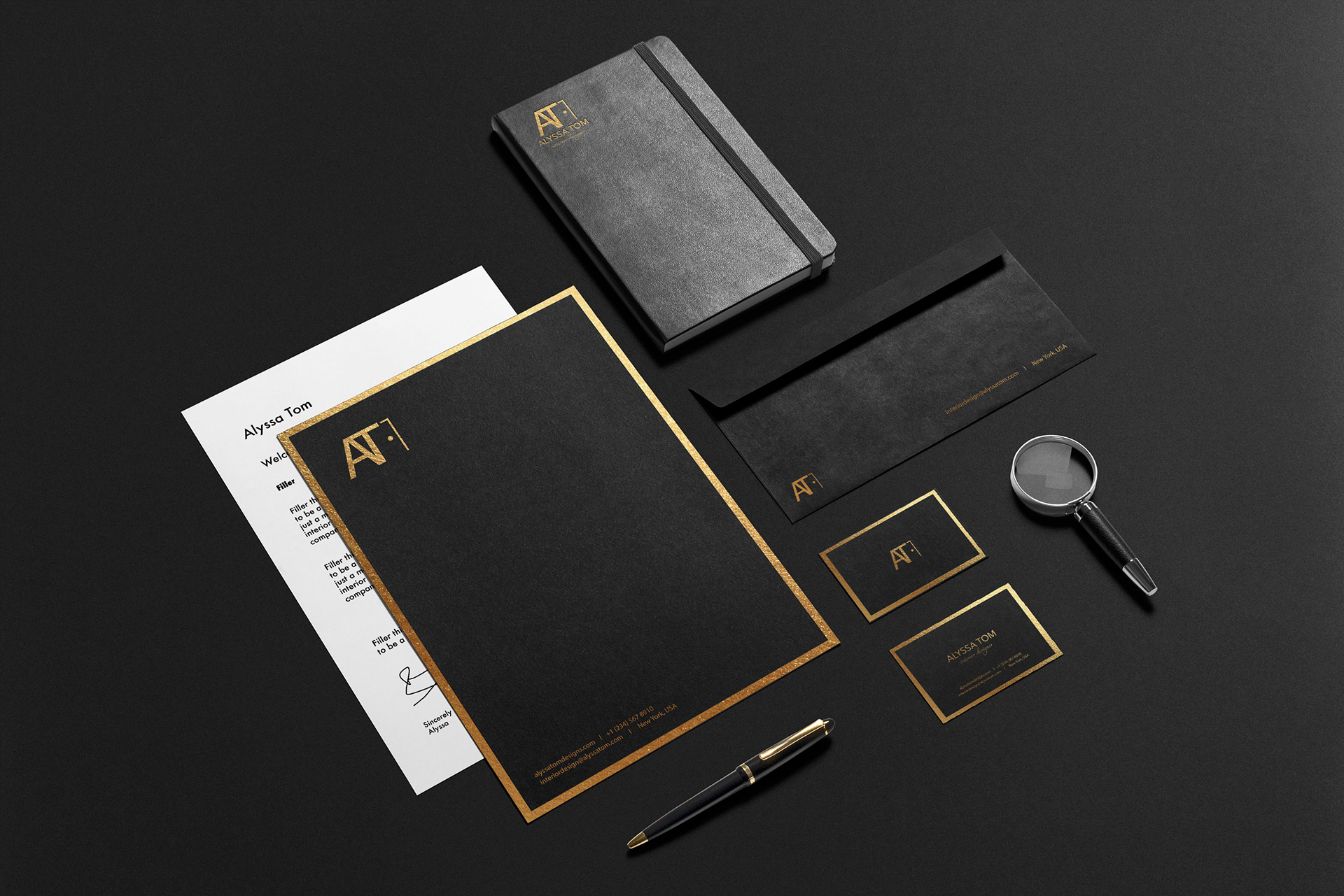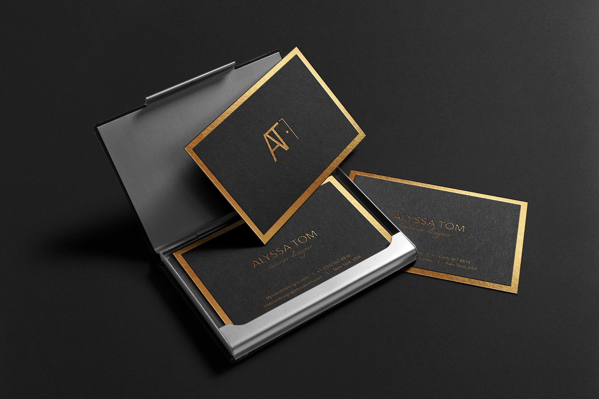 For a luxury interior designer, I utilized the client's initials and an outline of a door to create the logo. To convey luxury, I chose gold foil to stand against matte black.