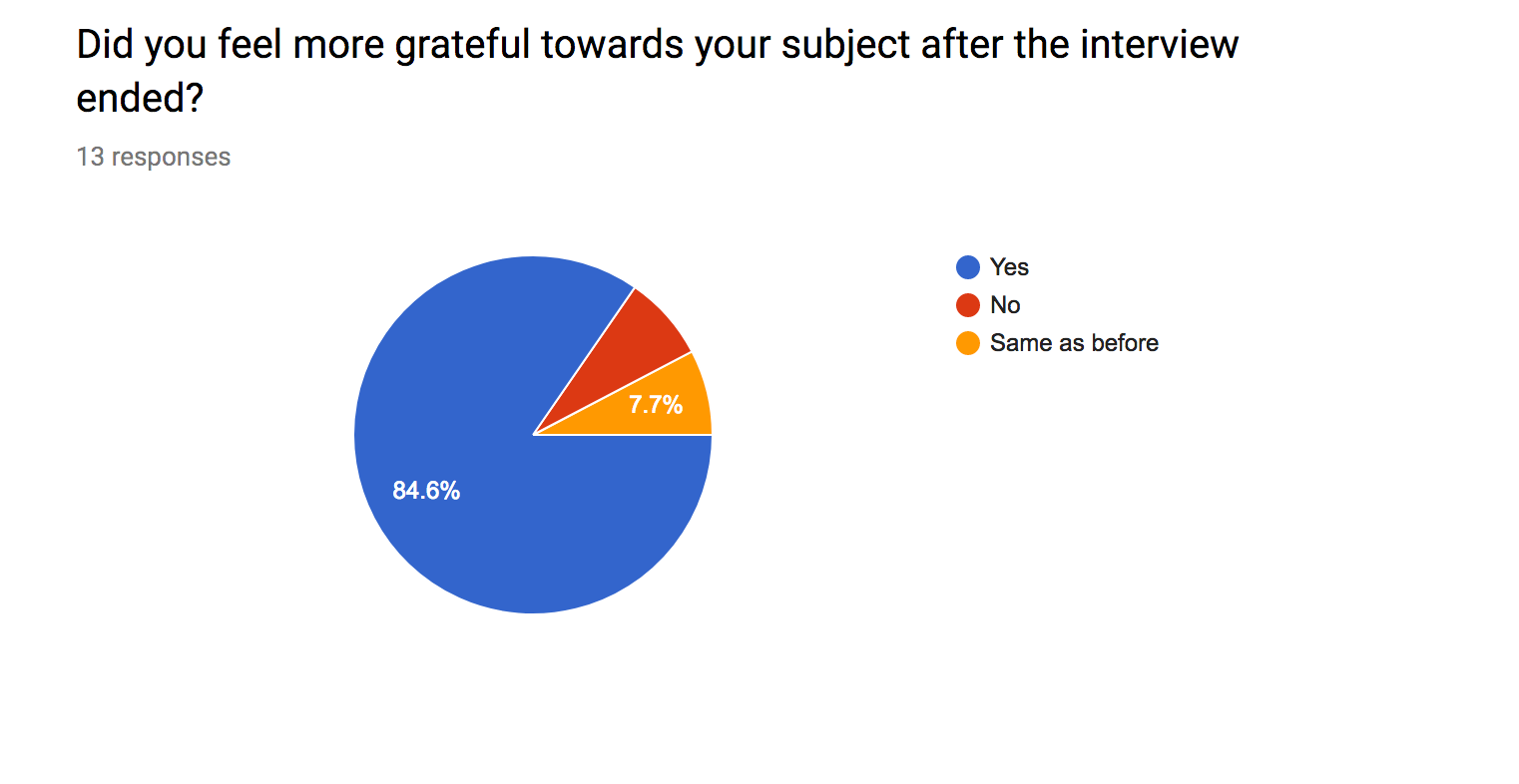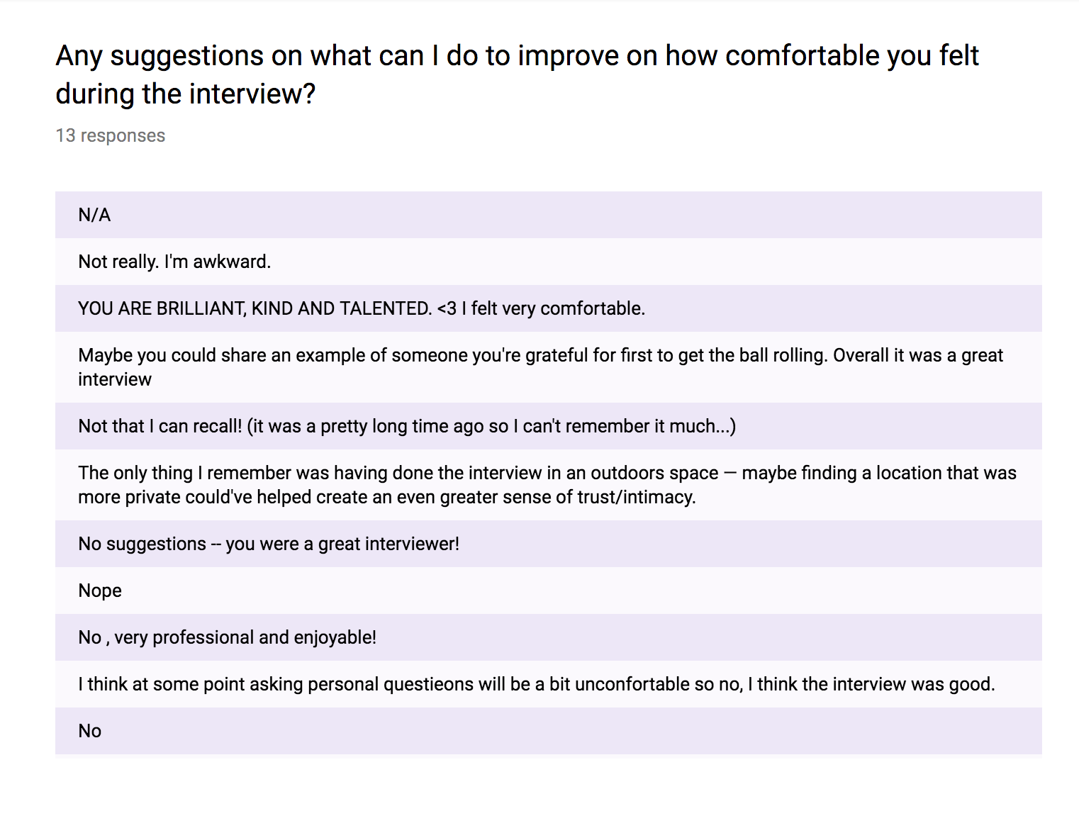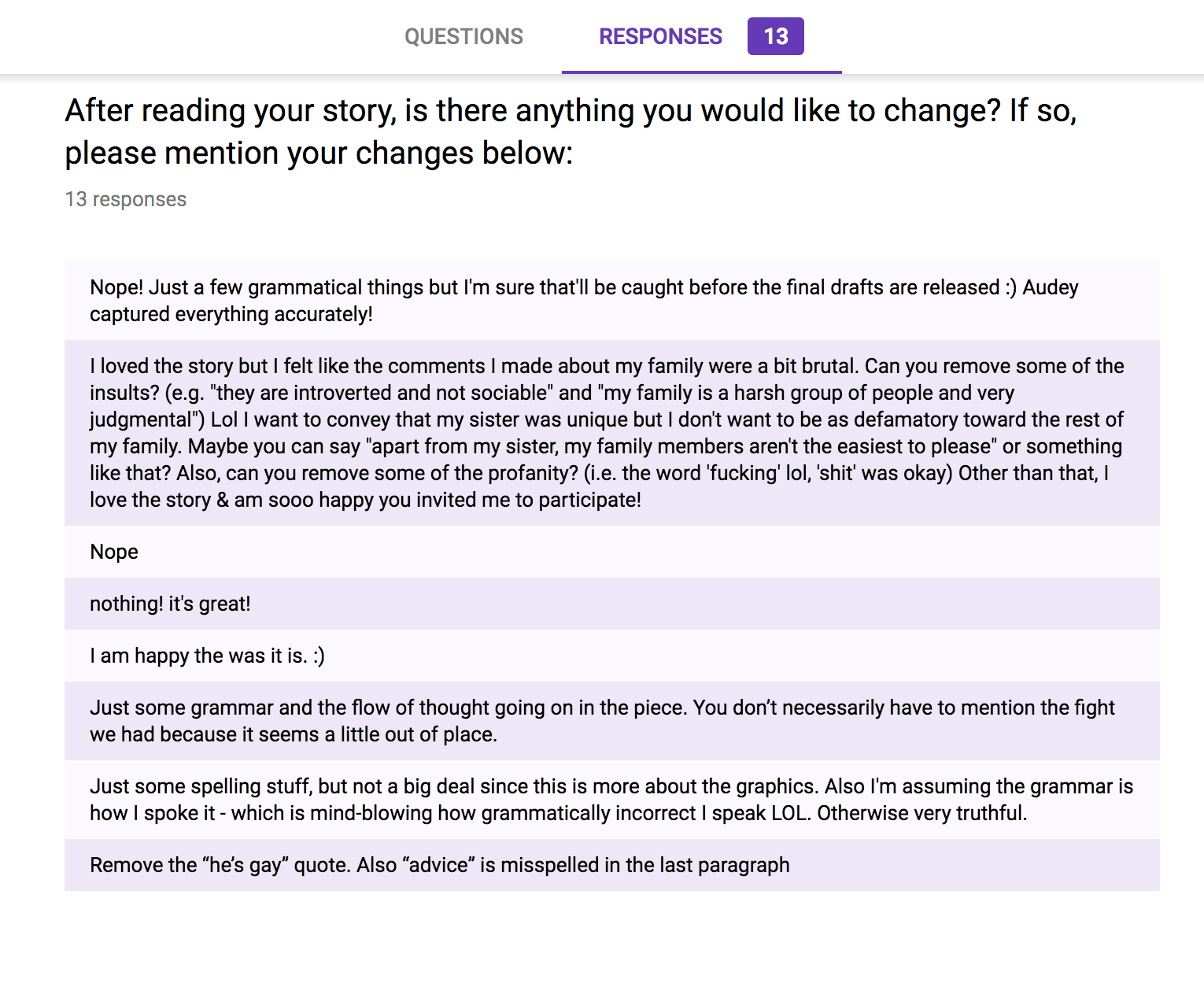 3. Finally, I sent all my interviewees a survey to make sure they were okay with my version of their story, as well as for feedback.