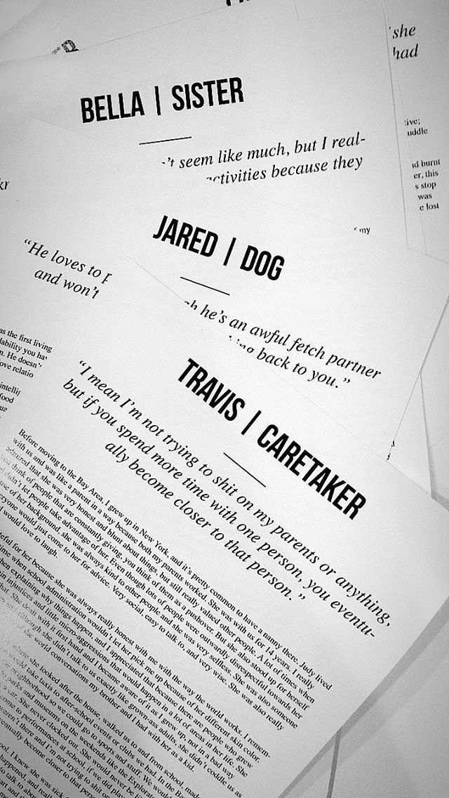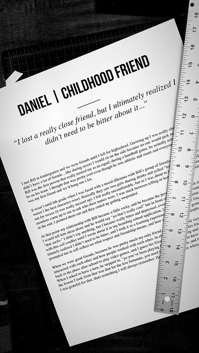 2. From our conversation and the notes I took, I pinpointed the moments that I believed were most poignant in their story to use for their illustration. Because I know there might be controversy that I am editing their story from my notes, and potentially changing their voice, I sent them the final version of their story and allowed them to make any changes they wished before publishing.